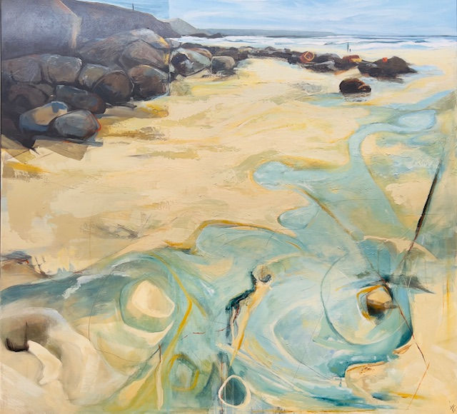 Walking on the beaches within the dominating structural landscapes, with her dogs who at times make an appearance in her work, she see these motifs and shapes in the rocks and tides that then become expressive methods of capturing the power and drama of the place. She also uses similar themes of pattern and texture in her Still Life work that captures elements from her everyday life and living environment.